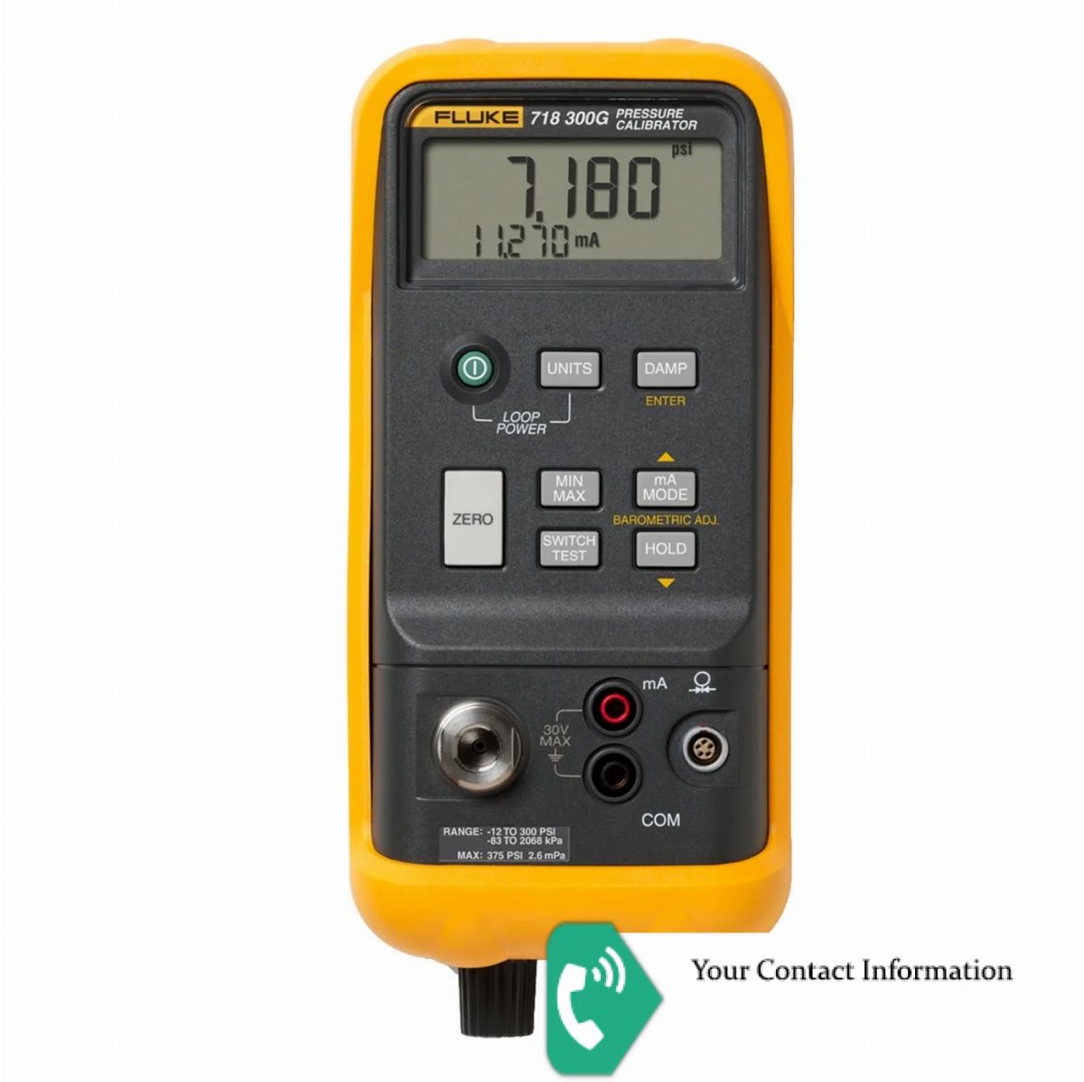 Fluke 718 Pressure Calibrator Range:-12 PSI to 300 PSI, (-850 mbar to 20.68 bar, -85 to 2068.42 kPa ) Resolution: 0.01 psi, 1 mbar Over Pressure: 375 PSI 25 bar Functions: Zero, Min, Max, Hold, Damp