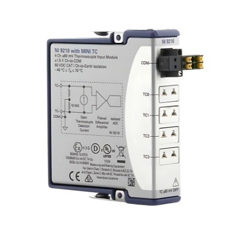 NI-9210 4-Channel, 14 S/s Aggregate, ±80 mVC Series Temperature Input Module ADC resolution : 24 bits Type of ADC : Delta-Sigma Sampling mode : Scanned Voltage measurement range : ±80 mV