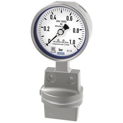 Differential pressure gauge For the process industry, all-metal media chamber Scale range : 0-1 Bar Nominal size (NS) = Ø 100 mm [4"] Type of measuring element: Diaphragm element size: 2 x ½ NPT, male thread s.s. M. O. P. : 25 Bar