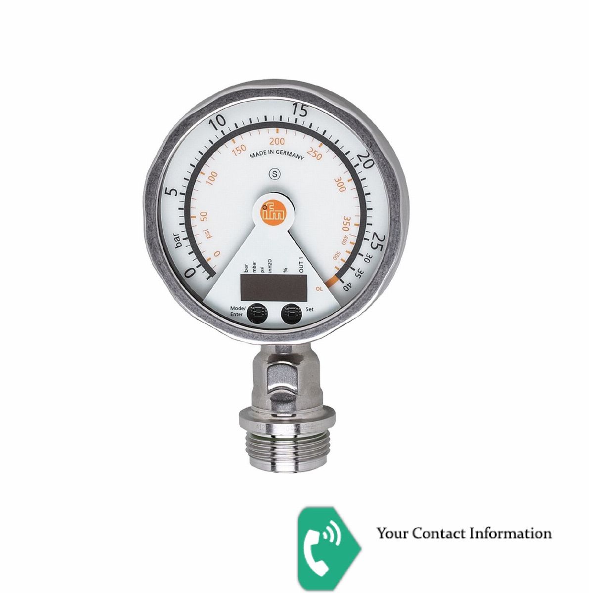 Flush pressure sensor with analogue display Number of digital outputs: 1 Number of analogue outputs: 1 Measuring range = -1...25 bar Process connection = threaded connection G 1 external thread Aseptoflex Vario