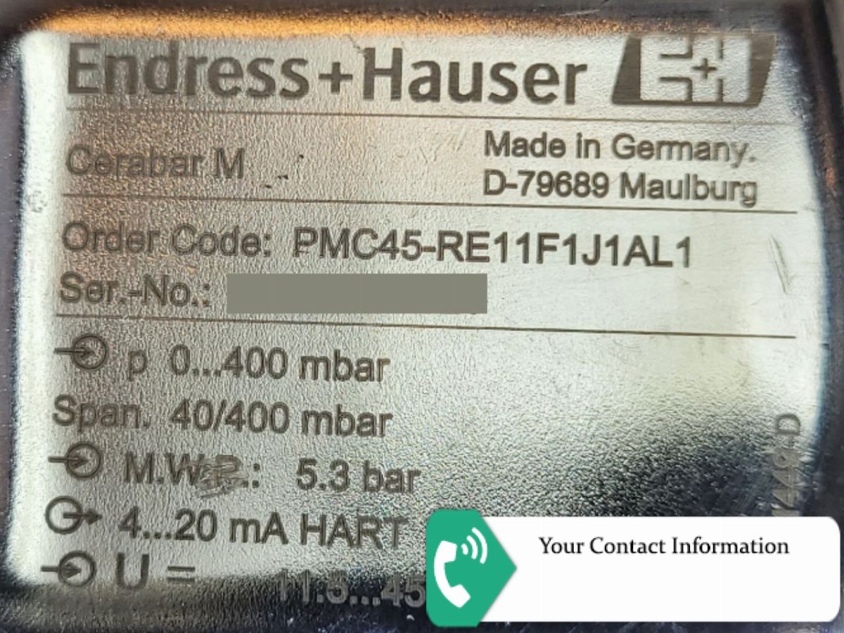 Cerabar M PMC45 PMC45-RE11F1J1AL1 Approval: R = Non-hazardous area Housing; Electrical Connection: E1 = F15 316L Hygiene; gland M20, IP66 Sensor Range; Sensor Overload Limit: 1F = 0...400mbar/40kPa/6psi gauge; 8bar/800kPa/120psi Calibration; Unit: 1 = 0.2% sensor range; mbar/bar Output; Operating: J = 4-20mA HART; display 4-digit + bargraph Additional Option: 1 = Basic version Process Connection: AL = DIN11851 DN50 PN25 slotted-nut, 316L, EHEDG, 3A with seal HNBR/EPDM Sensor Seal: 1 = FKM Viton