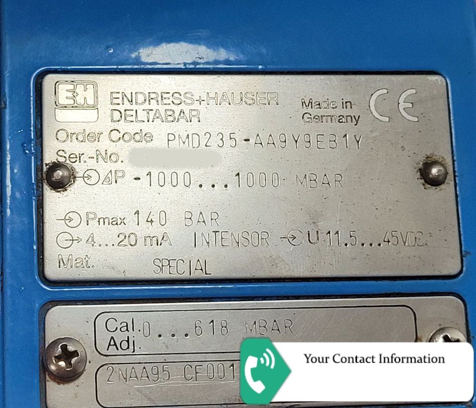 PMD235-AA9Y9EB1Y Cable Entry; Approval: A = Cable gland: Pg13.5 Output; Housing: A = 4-20mA INTENSOR, top LCD-display Nominal Range; Diaphragm Material; PN: 9Y = Special version Calibration; Unit: 9 = adjusted; see additional spec Additional Option: EB = 2 blind taps Seal: 1 = FKM Viton Process Connection: Y = Special version, TSP-no. to be spec