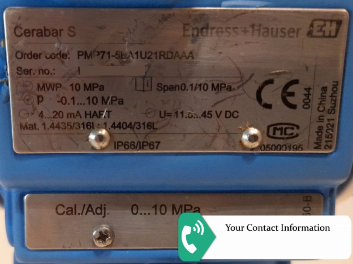 Cerabar S PMP71 PMP71-5BA1U21RDAAA Approval: 5 = ATEX II 2G Ex db IIC T6 Gb Output; Operating: B = 4-20mA HART; inside + LCD Housing; Cover Sealing; Cable Entry: A = T14 Alu IP66/67 NEMA6P; EPDM; M20 gland, T14 = side cover (Ex d > M20 thread) Sensor Range; Sensor Overload Limit: 1U = 100bar/10MPa/1500psi gauge; 400bar/40MPa/6000psi Calibration; Unit: 2 = Sensor range; kPa/MPa Membrane Material: 1 = 316L Process Connection: RD = Thread ANSI MNPT1/2 hole, 316L Fill Fluid: A = Silicone oil Additional Option 1: A = Not selected Additional Option 2: A = Not selected