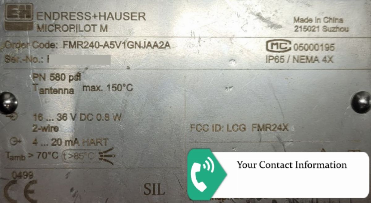Micropilot M FMR240 FMR240-A5V1GNJAA2A Approval: A = Non-hazardous area Antenna: 5 = 100mm/4" Antenna Seal; Temperature: V = FKM Viton; -20...150oC/-4...302oF Antenna Extension: 1 = Not selected Process Connection: GNJ = Thread ANSI NPT1-1/2, 316L Output; Operation: A = 4-20mA SIL HART;4-line display VU331, Envelope curve display on site Housing: A = F12 Alu, coated IP65 NEMA4X Cable Entry: 2 = Gland M20 (EEx d > thread M20) Additional Option: A = Basic version