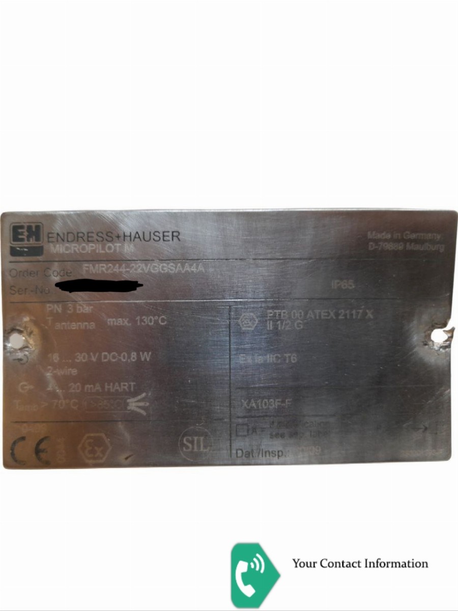 Micropilot M FMR244 FMR244-22VGGSAA4A Approval: 2 = ATEX II 1/2G EEx ia IIC T6, XA Note safety instruction (XA) (electrostatic charging)! Antenna: 2 = 40mm/1-1/2", PTFE encapsulated Antenna Seal; Temperature: V = FKM Viton GLT; -40...130oC/-40...266oF Process Connection: GGS = Thread ISO228 G1-1/2, PVDF Output; Operation: A = 4-20mA SIL HART;4-line display VU331, Envelope curve display on site Housing: A = F12 Alu, coated, IP65 NEMA4X Cable Entry: 4 = Thread NPT1/2 Additional Option: A = Basic version
